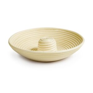 Los moldes de fermentación BANNETON IBILI nos facilitan el trabajo a la hora manipular la masas. Nos ayudan a mantener una forma más consistente en masas hidratadas, a apreciar mejor el punto de fermentación guiándonos por las espirales de mimbre y a transportar y volcar las masas sobre la bandeja de horno más cómodamente. Por otro lado nos aportan formas en espiral de la corteza muy atractivas. Banneton corona con medida de 28 cm de diámetro