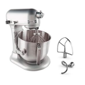 CERTIFICACIÓN NSF PARA USO COMERCIAL Con el más potente y silencioso motor de 1.3 caballos de fuerza (HP) de alta eficiencia la Batidora Comercial KitchenAid® está diseñada para una operación continua y le ofrece un par de torsión óptimo con menor almacenamiento de calor. Maneja fácilmente recetas que requieren un largo tiempo de mezclado, batido y amasado. El diseño todo de metal de los engranajes, produce un sonido leve y silencioso. Todas las batidoras kitchenaid incluyen los accesorios globo, paleta, gancho y bowl. KSM8990NP