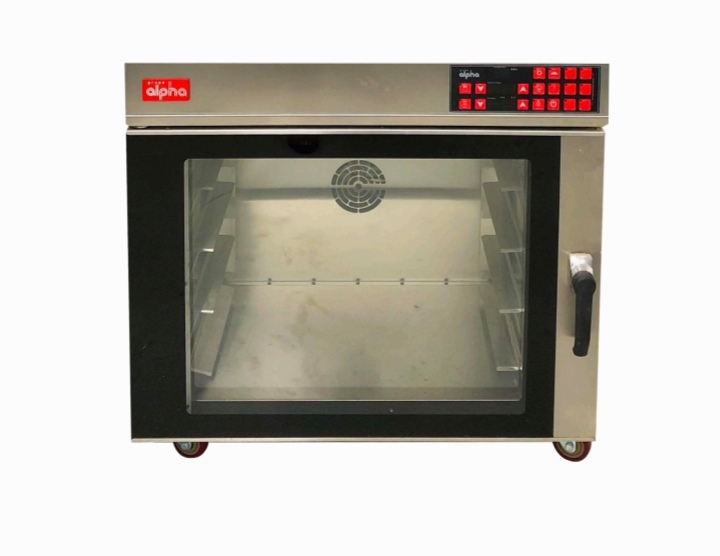 Frente 0.84 m, profundidad .88 m, altura del equipo 0.80 m, alimentación eléctrica 220V/2F/60Hz, consumo eléctrico 6.5 Kw y con capacidad se 4 charolas de 40×60 cm.
