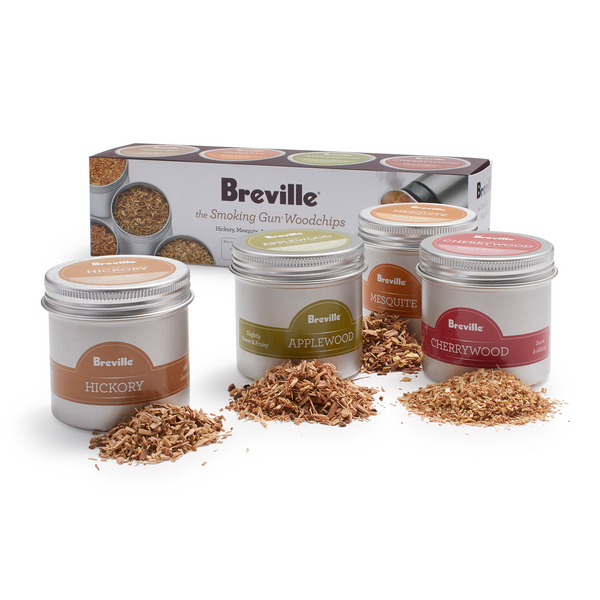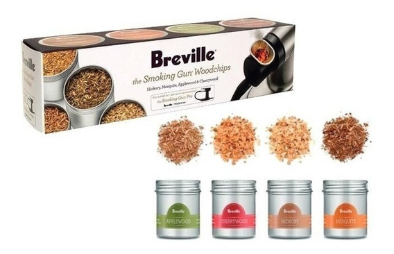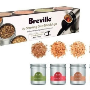 El kit de chips para pistola ahumadora incluye cuatro (4) frascos de 4 oz de astillas de madera; Hickory, madera de manzano, madera de cerezo y mezquite.
