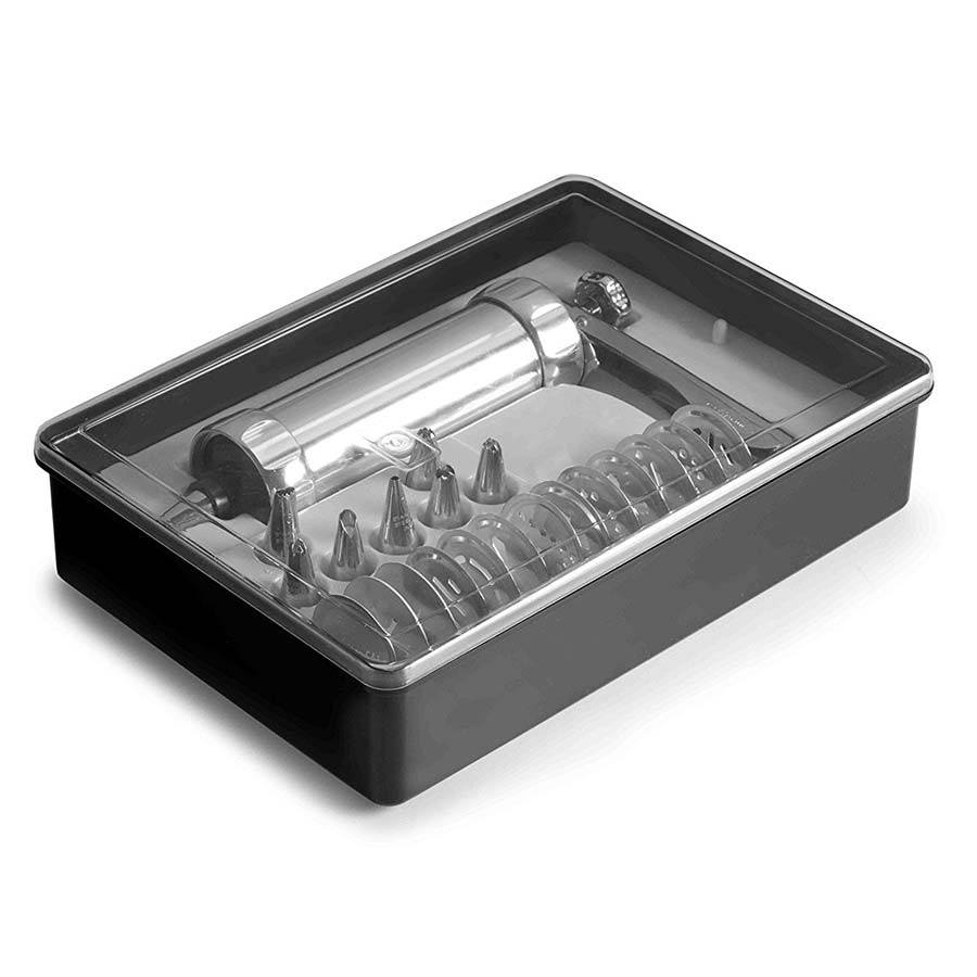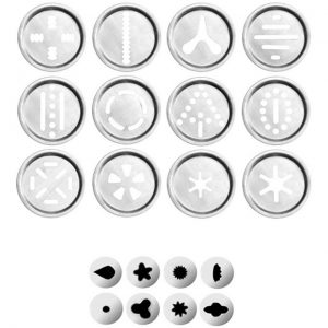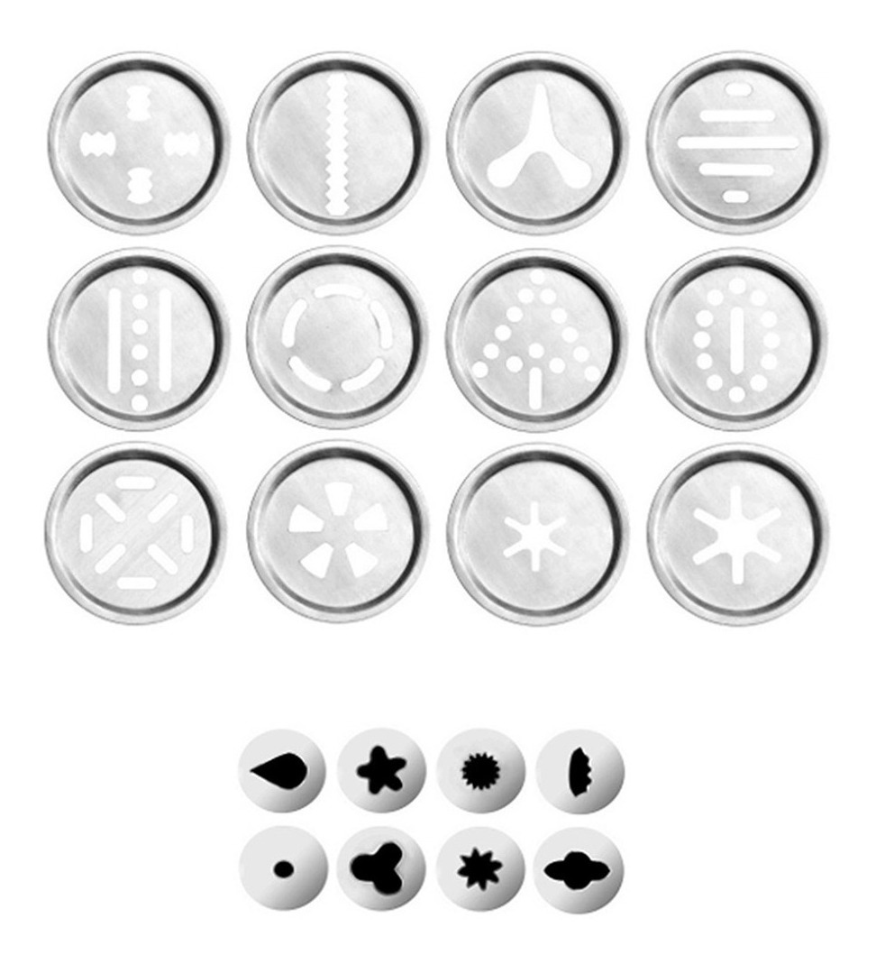 Es una churrera pistola para hacer de todo un poco bien sea, galletas o churros. Está fabricada en aluminio además incluye 8 boquillas para la decoración y unos 13 discos.