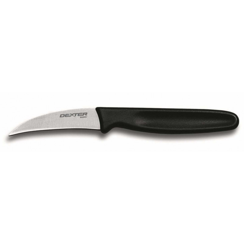 El cuchillo mondador tiene una cuchilla que mide 2-1 / 2 «y está hecha de acero de alto carbono sin manchas, que es de tierra hueca para un fácil mantenimiento de los bordes y un afilado rápido. El mango negro está hecho de un polipropileno duradero y antideslizante.