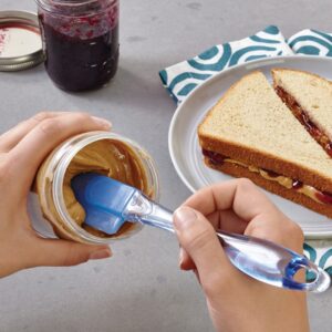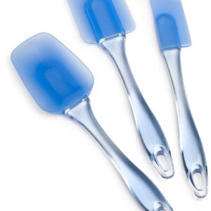 Juego de 3 piezas de espátulas flexibles de silicona en azul. Incluye espátulas de tamaño pequeño, mediano y una espátula grande de tamaño cuchara con mangos de plásticos translucidos de color azul, con forma de cristal, con agujeros para colgar. Resistente al calor hasta 176°C-350 °F.