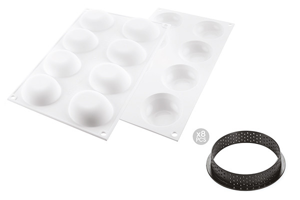 AROS DE MATERIAL TERMOPLASTICO COMPUESTO, PUEDE USARSE PARA HORNEAR HASTA 180°C Y PARA CONGELAR HASTA -60°C. MOLDE DE SILICON PUEDE USARSE PARA HORNEAR HASTA 230°C Y PARA CONGELAR HASTA -60°C. MOLDE 100% HECHO EN ITALIA. CONTIENE 8 AROS DE 7 CM DE DIAMETRO Y MOLDE DE SILICON DE 8 CAVIDADES CON CAPACIDAD DE 47 ML Y MEDIDAS h18MM, Ø64MM.