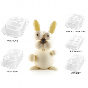 Kit compuesto por 5 moldes termoformados creados por diseñadores profesionales de Silikomart en colaboración con el chef de pastelería y chocolate Raúl Bernal para la realización de un objeto de chocolate 3D con forma de conejito. Tamaño: 140 x 150 h 256 mm
