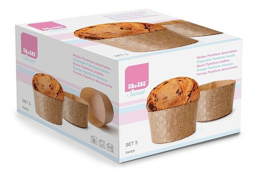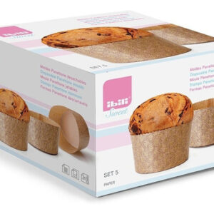 Set 5 moldes para panettone. Fabricados en papel encerado que nos permite desmoldarlos fácilmente, soporta Temperatura de hasta 200ºC y tiene las siguientes dimensiones 14 cm de diámetro X 10cm de alto.
