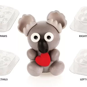 Kit compuesto por 5 moldes termoformados creados por diseñadores profesionales de Silikomart en colaboración con el chef de pastelería y chocolate Raúl Bernal para la realización de un objeto de chocolate 3D con forma de koala con corazón. Medidas 155 MM x 116 MM x h160 MM.