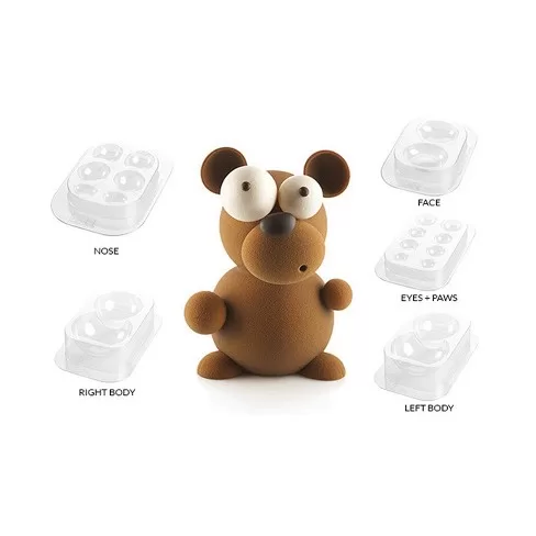 Kit compuesto por 5 moldes termoformados creados por diseñadores profesionales de Silikomart en colaboración con el chef de repostería y chocolate Raúl Bernal para la realización de un objeto de chocolate en 3D con forma de oso. Tamaño: 161 x h 210 mm.
