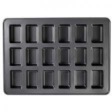 Molde para mini panqué con recubrimiento antiadherente para que los panes sean fáciles de desmoldar sin romperse. Con 18 cavidades con medidas de 9.5 X 6 X h3.5 cm.