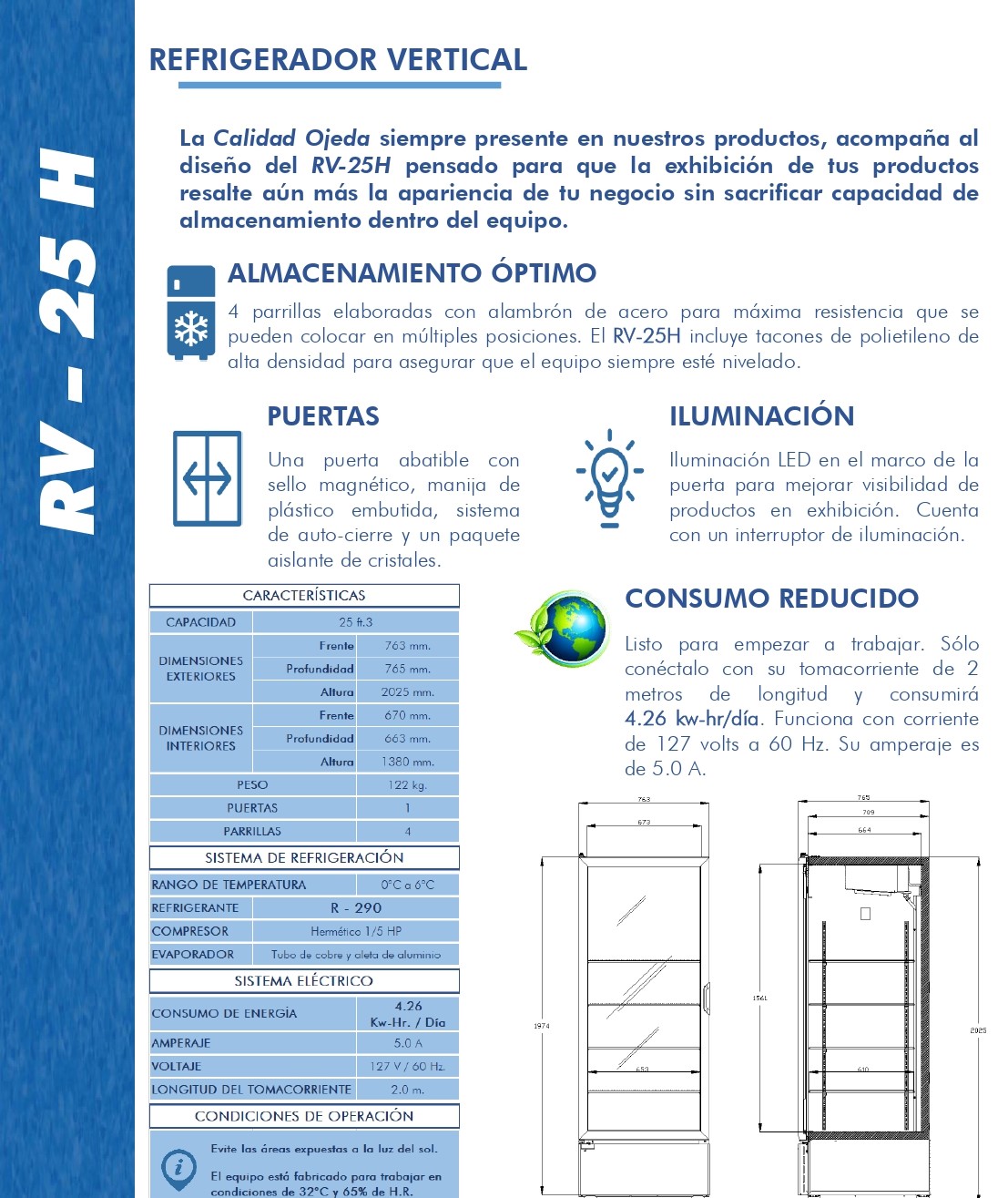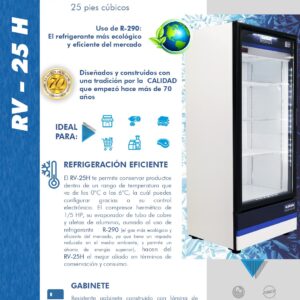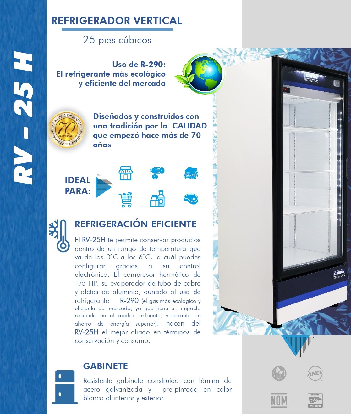 El refrigerador más ecológico y eficiente del mercado, diseñado y construido con una tradición por la calidad que empezó hace más de 70 años. El RV-25H te permite conservar productos dentro de un rango de temperatura que va de los 0°C a los 6°C, la cuál puedes configurar gracias a su control electrónico. El compresor hermético de 1/5 HP, su evaporador de tubo de cobre y aletas de aluminio, aunado al uso de refrigerante R-290 (el gas más ecológico y eficiente del mercado, ya que tiene un impacto reducido en el medio ambiente, y permite un ahorro de energía superior), hacen del RV-25H el mejor aliado en términos de conservación y consumo.