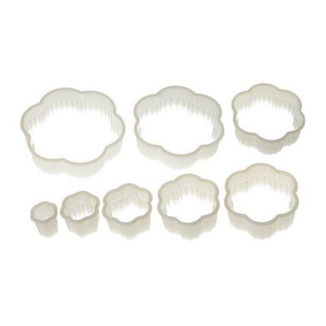SET CON 8 CORTADORES EN FORMA DE FLOR CON MEDIDAS 13 mm x 4 mm x altura 13 mm, Ø120 mm