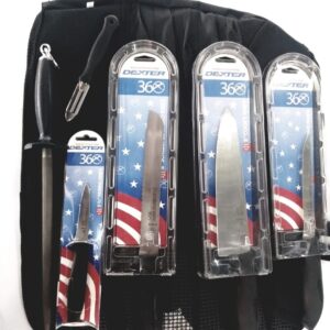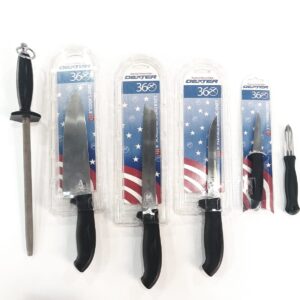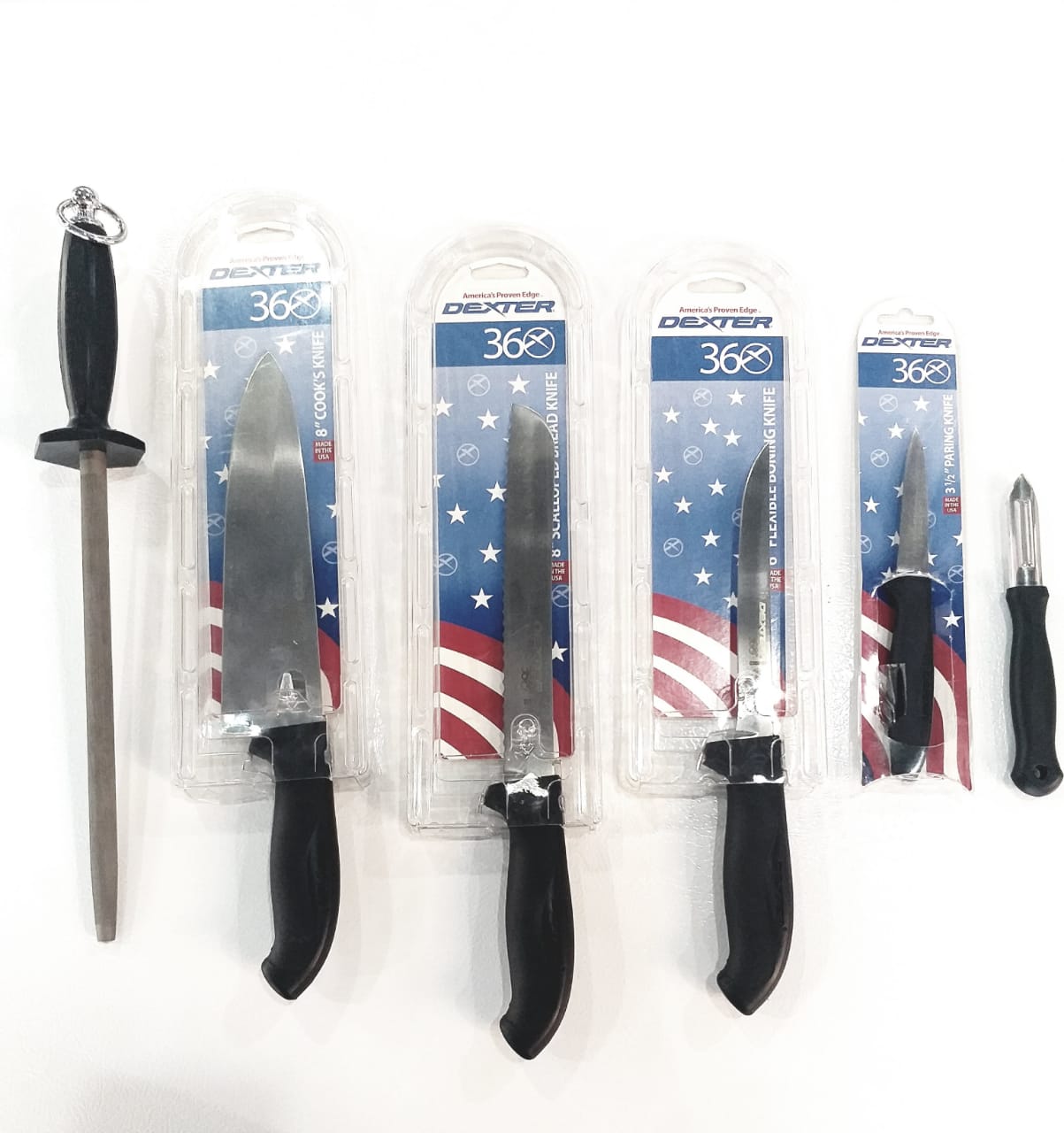 SET DE CUCHILLOS MARCA DEXTER LINEA 360 INCLUYE: CHAIRA 10″,CUCHILLO DE COCINA 8″, CUCHILLO PARA PAN 8″, CUCHILLO DESHUASADOR 6″, CUCHILLO MONDADOR 3 1/2″, PELADOR DE VERDURAS Y ESTUCHE PARA CUCHILLOS.